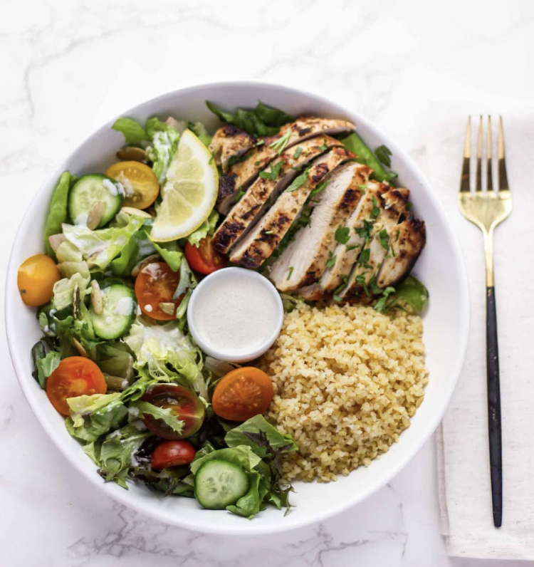 Skipping meals is also not a good plan. The sudden peaks and valleys of blood sugar levels aren’t great for hormone balance or insulin resistance either. (If we eat a lot and then none at all for a long time, our bodies go into emergency survival mode again.) So, opt for 3-4 balanced meals a day and don’t skip out. Here’s a good example of a balanced meal that’s blood sugar regulating and hormone balancing: It’s 1/4 protein, 1/4 carbs, and the rest of the plate veggies and healthy fats. You can find this meal in The Cysterhood App, the Greek Chicken Bowl!